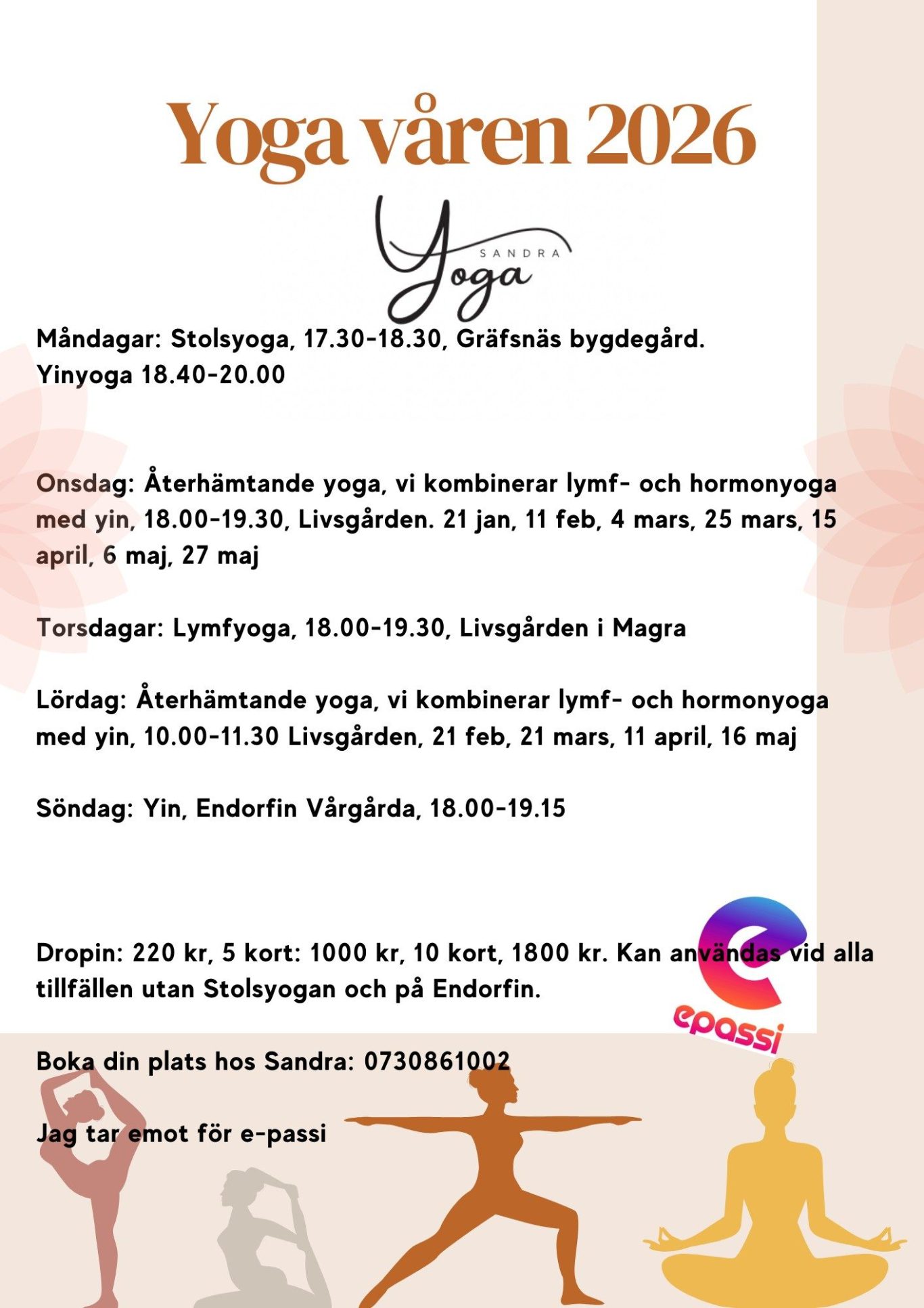 Jag tar emot för 10-kort, 5- kort, drop-in, retretas och återhämtningsdagar.